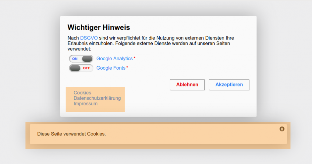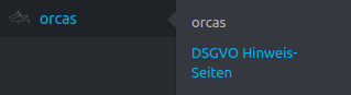 Nach der Installation, finden Sie auf der linken Seite im WordPress-Backend den Reiter „orcas“ → „DSGVO Hinweis-Seiten“. Dort können Sie einzelne Einträge des später erscheinenden Dialogs erstellen um Ihre User über alle externen Dienste zu informieren.