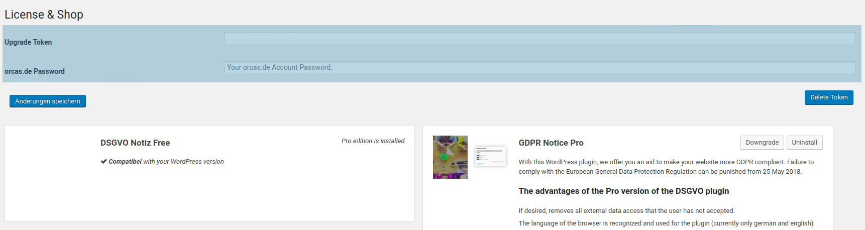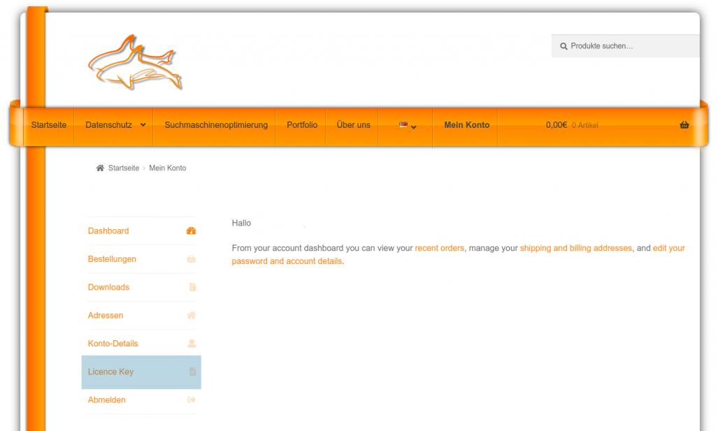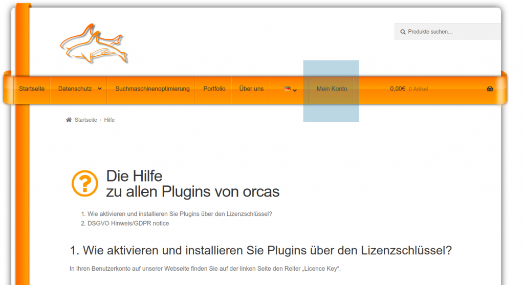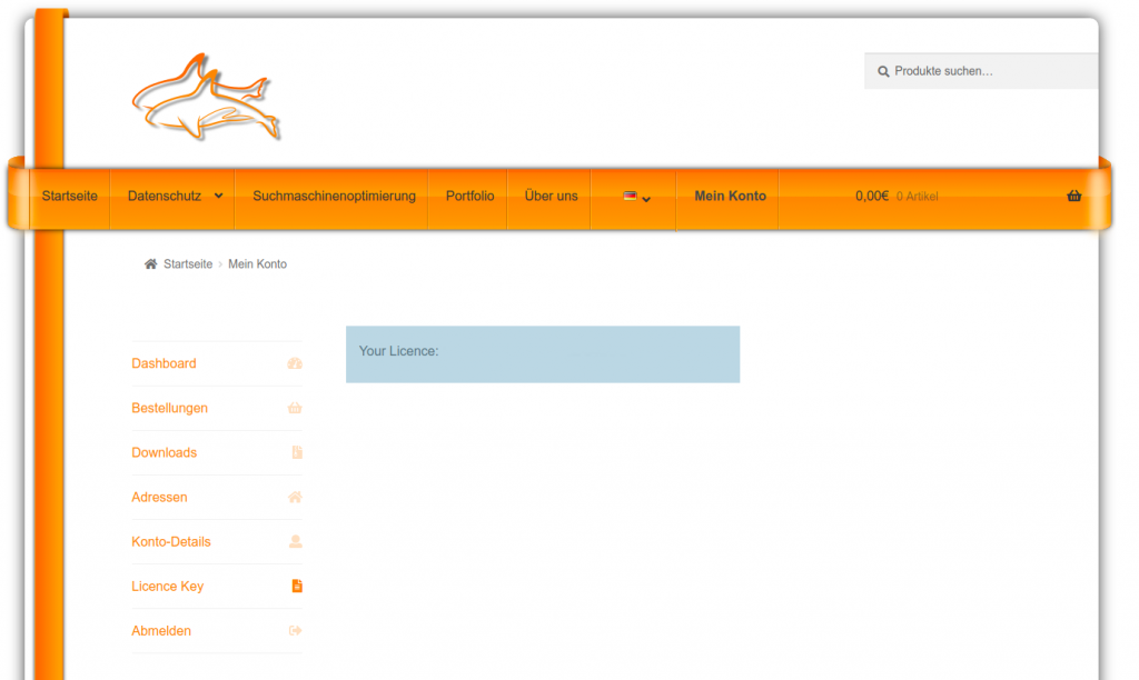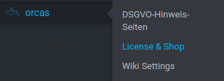 Dort finden Sie Ihren persönlichen Schlüssel. Um diesen zu verwenden, müssen Sie bereits ein Free-Plugin von uns auf Ihrer WordPress Instanz installiert haben. Im Admin-Backend Ihrer Webseite finden Sie dann auf der linken Seite den Reiter „orcas“ –> „Licence & Shop“.