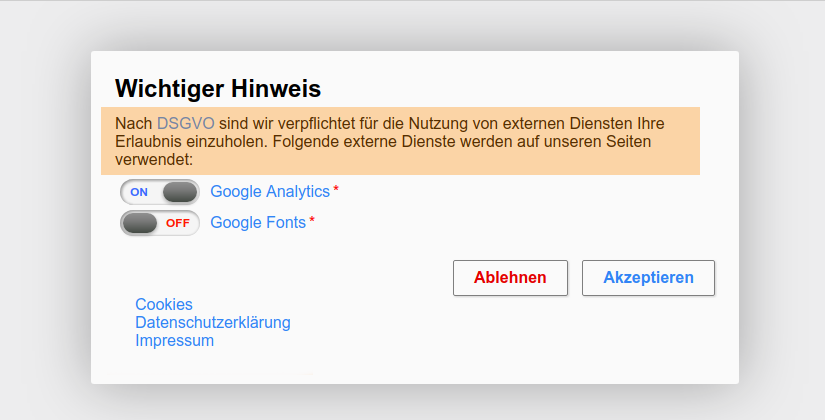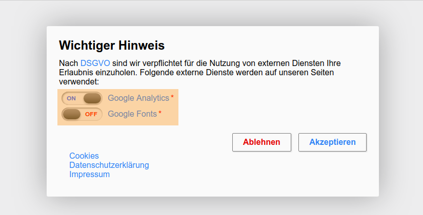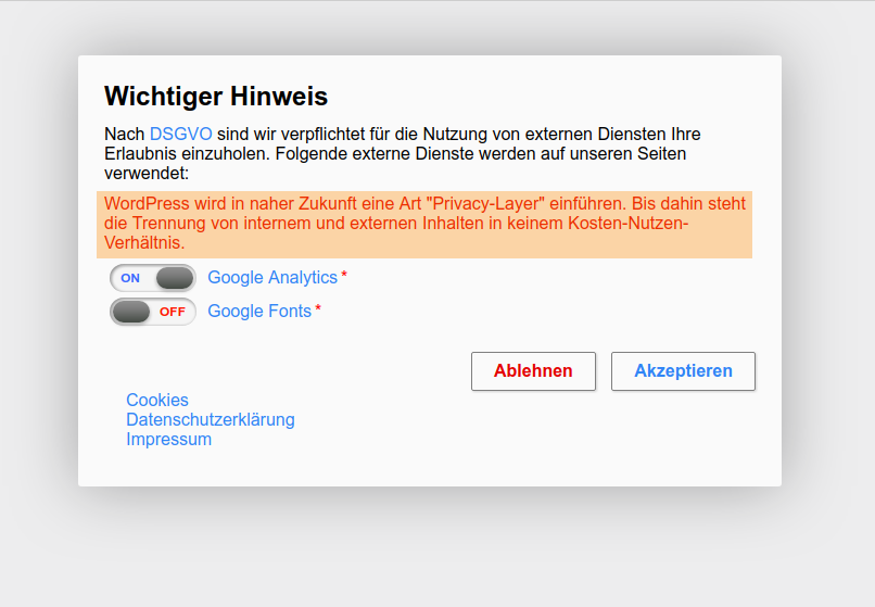 Dieser Typ ist mit der wichtigste Aspekt in unserem Plugin. Hier kann der Nutzer sehen, welche externen Dienste genutzt werden und diese auch an und aus schalten. Zusätzlich gibt es hier die Möglichkeit, dass der Nutzer auf den „Link“ klicken kann um mehr zu erfahren.