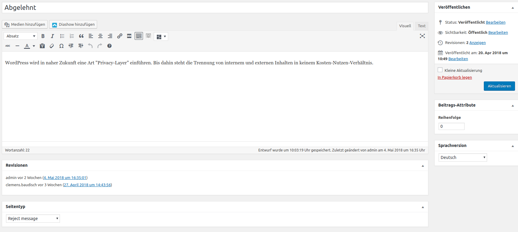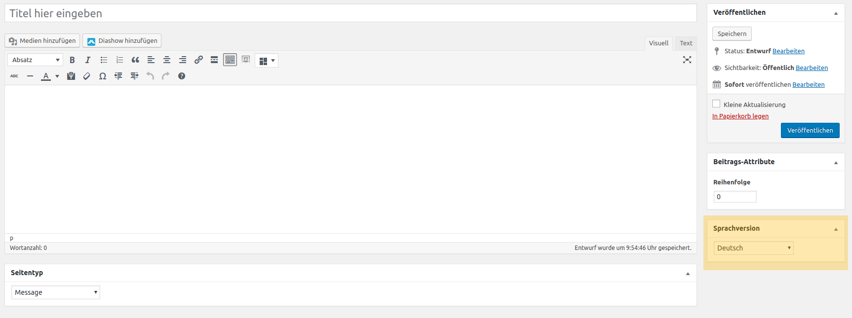 Ebenfalls auf der rechten Seite, findet man noch die „Sprachversion“ des Eintrags. Das Plugin erkennt automatisch, welche Sprache der Browser des Nutzers hat und zeigt daraufhin alle Einträge an, welche auf diese Sprache eingestellt sind. Natürlich muss die Sprache auch vorhanden sein.